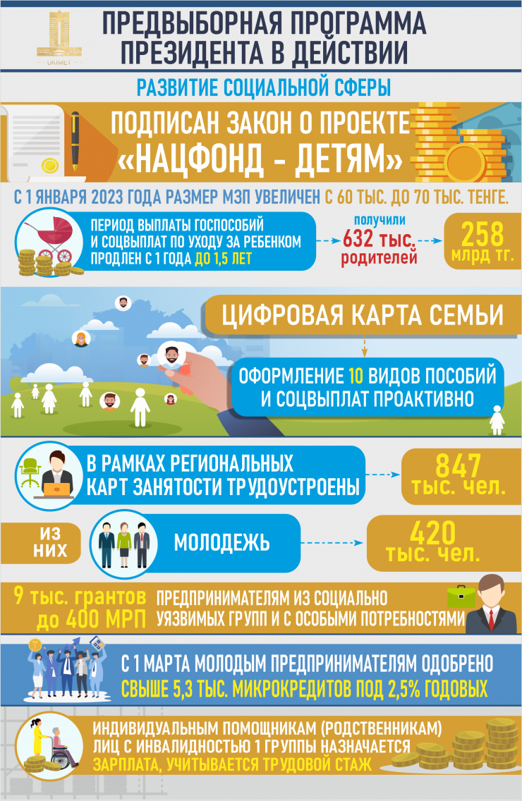 С 1 января 2023 года размер минимальной заработной платы увеличен с 60 тысяч до 70 тысяч тенге. Благодаря этому выросли денежные доходы порядка 1,8 миллиона наемных работников, занятых во всех отраслях на предприятиях различных форм собственности. Период выплаты государственных пособий и социальных выплат по уходу за ребенком увеличен с 1 года до 1,5 года. По состоянию на 1 ноября порядка 632 тысяч родителей получили выплаты на сумму свыше 258 миллиардов тенге.