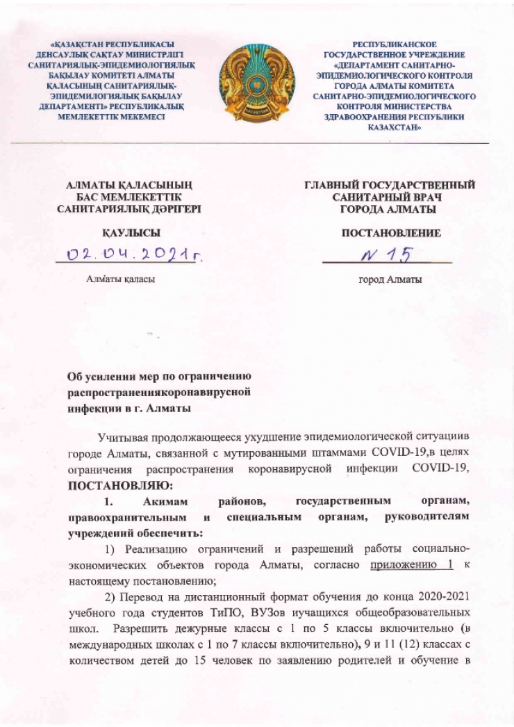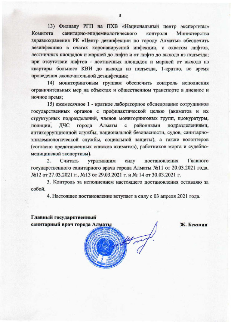Постановление вступает в силу с 3 апреля. Полный текст постановления опубликован на странице Департамента санитарно-эпидемиологического контроля города Алматы.