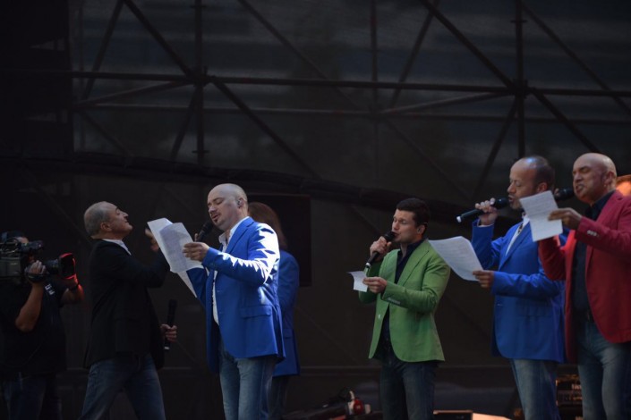 Артисты исполнили две казахские песни "Аулым" и "Көзімнің қарасы". Также вы их исполнении прозвучала песня Батырхана Шукенова "Джулия". Артисты в буквальном смысле устроили караоке, исполняя все известные хиты из кинофильмов, песни известных артистов современности и народные песни. Пришедшие на концерт гости и жители столицы подпевали артистам.