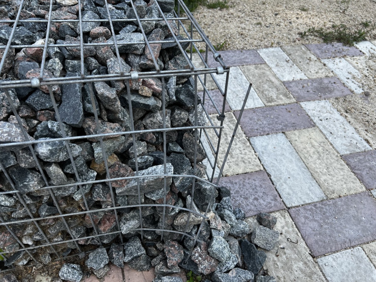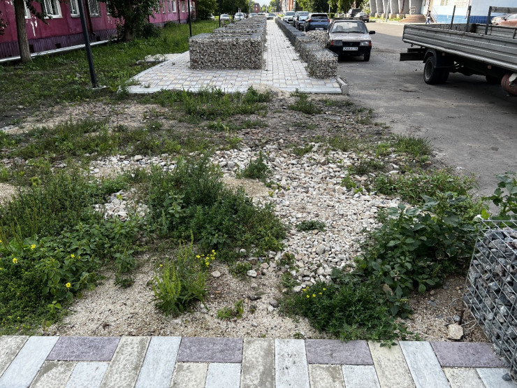 Некоторые сетки уже разрушены, из них торчат острые прутья, что не только неэстетично, но и небезопасно для прохожих. Брусчатка в некоторых местах уже развалилась, несмотря на то что сквер новый. Не добавляет красоты общему виду и куча брошенного щебня.