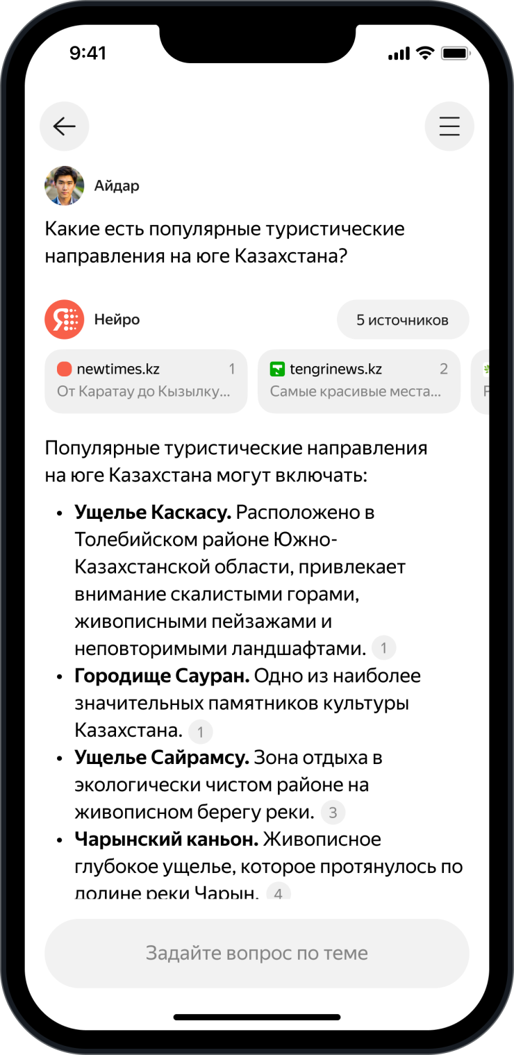 Нейро понимает естественный язык общения. Чтобы спросить его о чем-то, не нужно подбирать формулировки: можно писать запросы так, как они приходят в голову. Кроме того, он умеет отвечать на вопросы, для которых обычно нужно изучить несколько источников. Например: "Какие есть популярные туристические направления на юге Казахстана?".