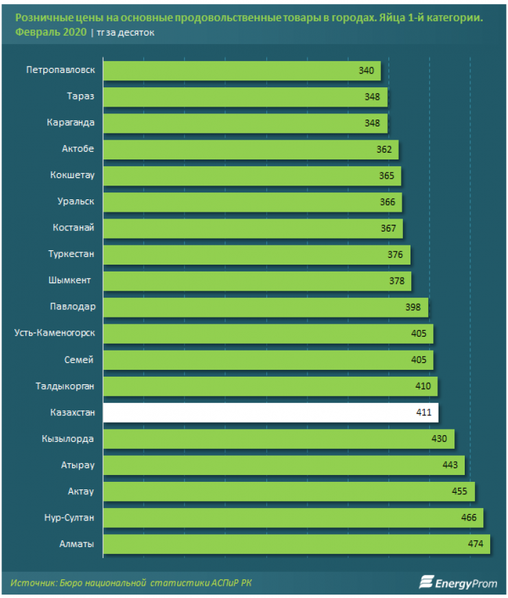 Дороже всего яйца обходились алматинцам (474 тенге за десяток), дешевле всего - жителям Петропавловска (340 тенге за десяток).