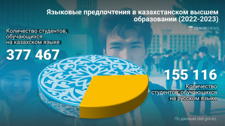 Как сообщили в Комитете высшего и послевузовского образования Министерства науки и высшего образования, в настоящее время в республике функционирует 119 вузов. Во всех вузах есть отделения с казахским и русским языками обучения. Сегодня высшее образование получают 578 237 студентов, из них почти три четверти, или 377 467, учатся на казахском языке и одна четверть, или 155 116 - на русском.