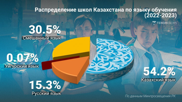 Сейчас в Казахстане функционируют 6909 государственных школ, из них больше половины (54 процента), или 3743 – с казахским языком обучения, 1055 – с русским языком обучения, 5 – с уйгурским языком обучения, 2106 – смешанные.