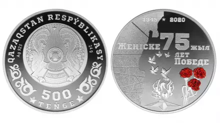 Национальный Банк Республики Казахстан 27 марта выпустил в обращение коллекционные монеты "75 лет Победе" из серии "Выдающиеся события и люди" из серебра номиналом 500 тенге, из сплава мельхиор номиналом 100 тенге и из сплава нейзильбер номиналом 100 тенге.