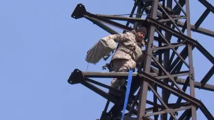 “За что меня уволили?“: бывший полицейский снова залез на опору ЛЭП
