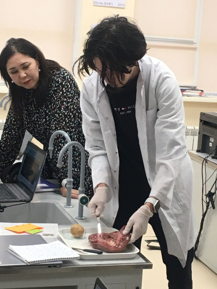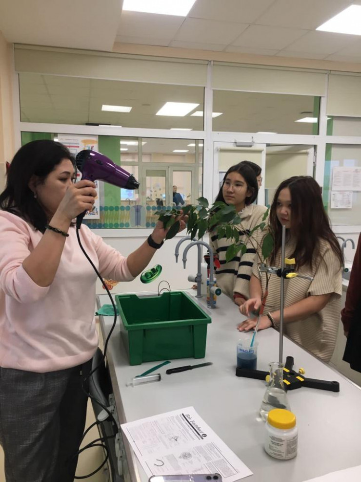 Бейбитгуль Дырынбаева с учеником во время опыта