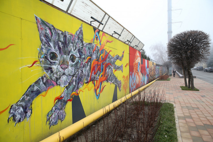 В итоге каждый мурал можно рассматривать бесконечно, ведь в настенных рисунках очень много деталей. Это и казахские национальные орнаменты, и популярные смайлы, и грациозные восточные красавицы. Все это наглядно показывает яркое разнообразие современного мира. Такие насыщенные и разнообразные сюжеты получились оттого, что над ними работали разные художник и каждый вложил в рисунок что-то свое. Например, Евгений Chervi посвятил работу своему коту, который недавно погиб в пожаре. Художник приютил усатого друга на балконе, а чтобы тот не замерз, установил радиатор. В итоге случился пожар, квартира сгорела, огонь унес жизнь четвероногого друга. В память о нем художник решил посвятить свою работу в проекте.