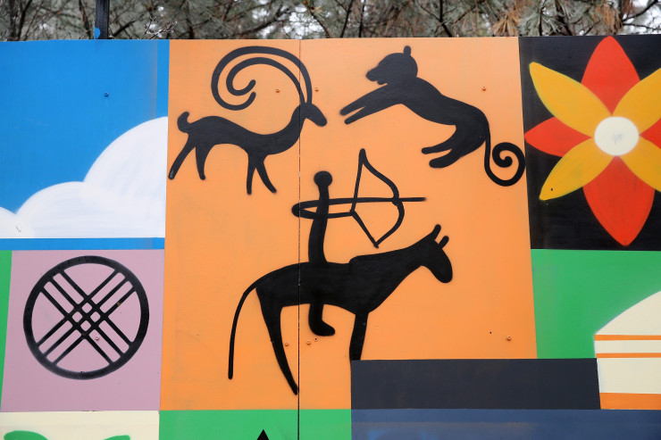 На этом огромном холсте длиной 420 метров создали десятки композиций, над которыми трудились 80 художников. Несмотря на то, что все сюжеты на первый взгляд кажутся разными, есть нечто, что их объединяет. Идея проекта в том, что он олицетворяет казахский алфавит. Каждый из художников выбрал себе определенную букву и, отталкиваясь от нее, создавал свой рисунок. К тому же алфавит ведь вообще имеет большое значение в творчестве стрит-артистов, у каждого есть собственная, особая подпись, так что буквенные символы для них символичны.
