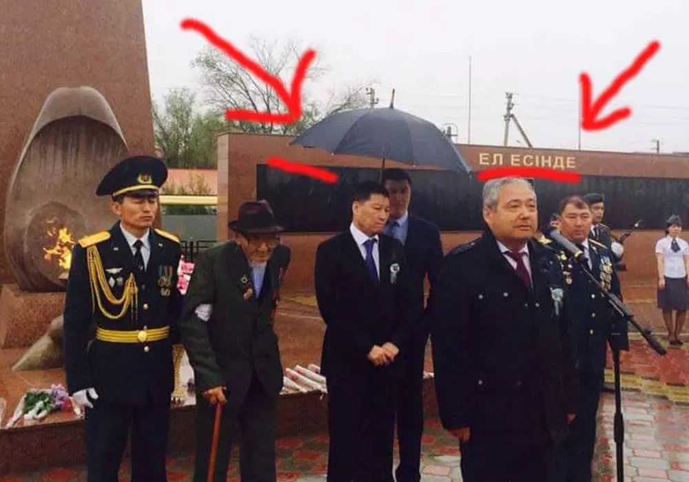 На фото, которое попало в Сеть, чиновник стоит под зонтом, в то время как под дождем рядом стоит ветеран Великой Отечественной войны, которому приблизительно 85-90 лет. Пользователи Facebook обсуждают кадр и не скрывают своего недовольства. Фотоснимком с замакима Атырауской области уже поделились более 400 человек.