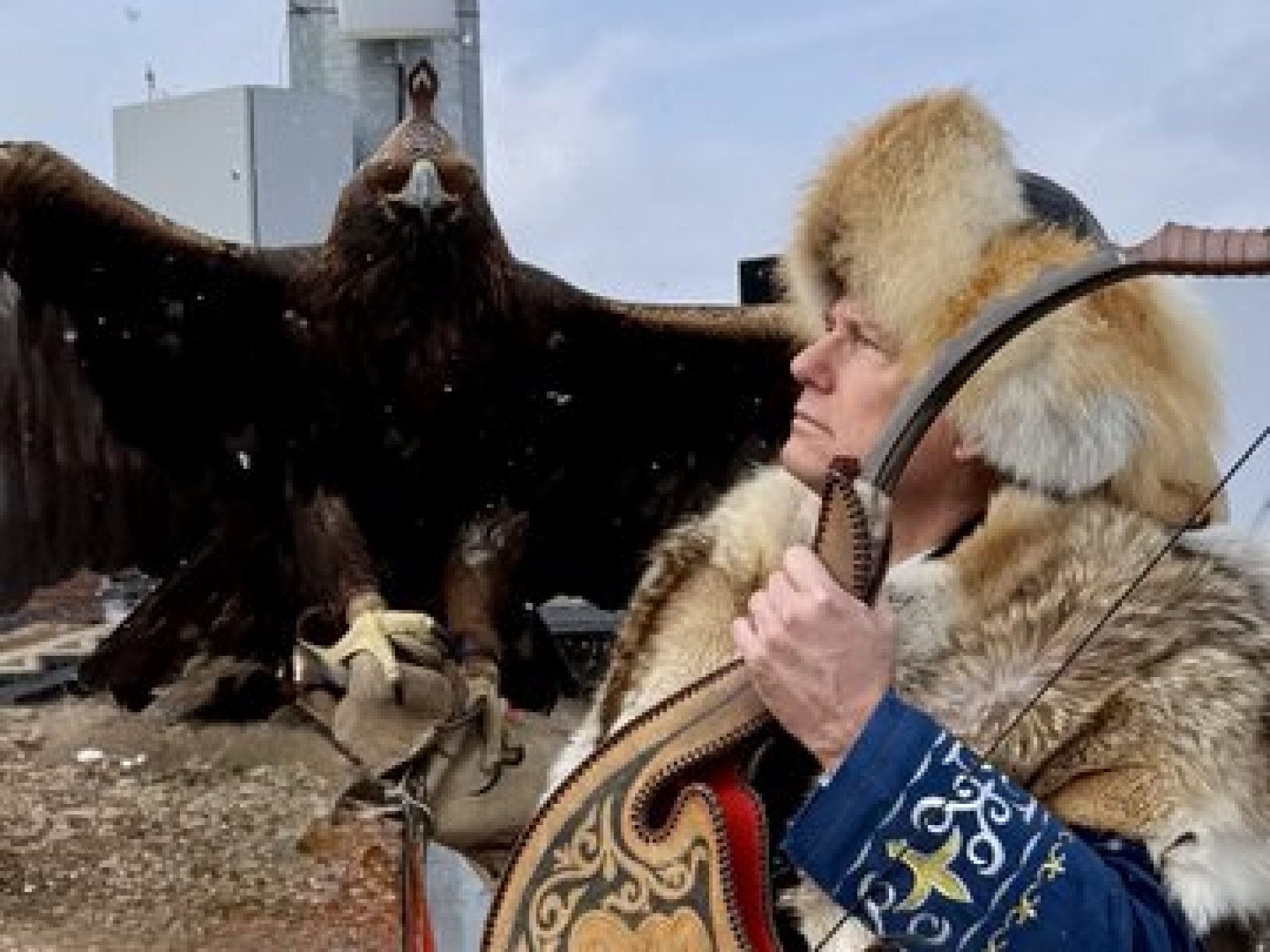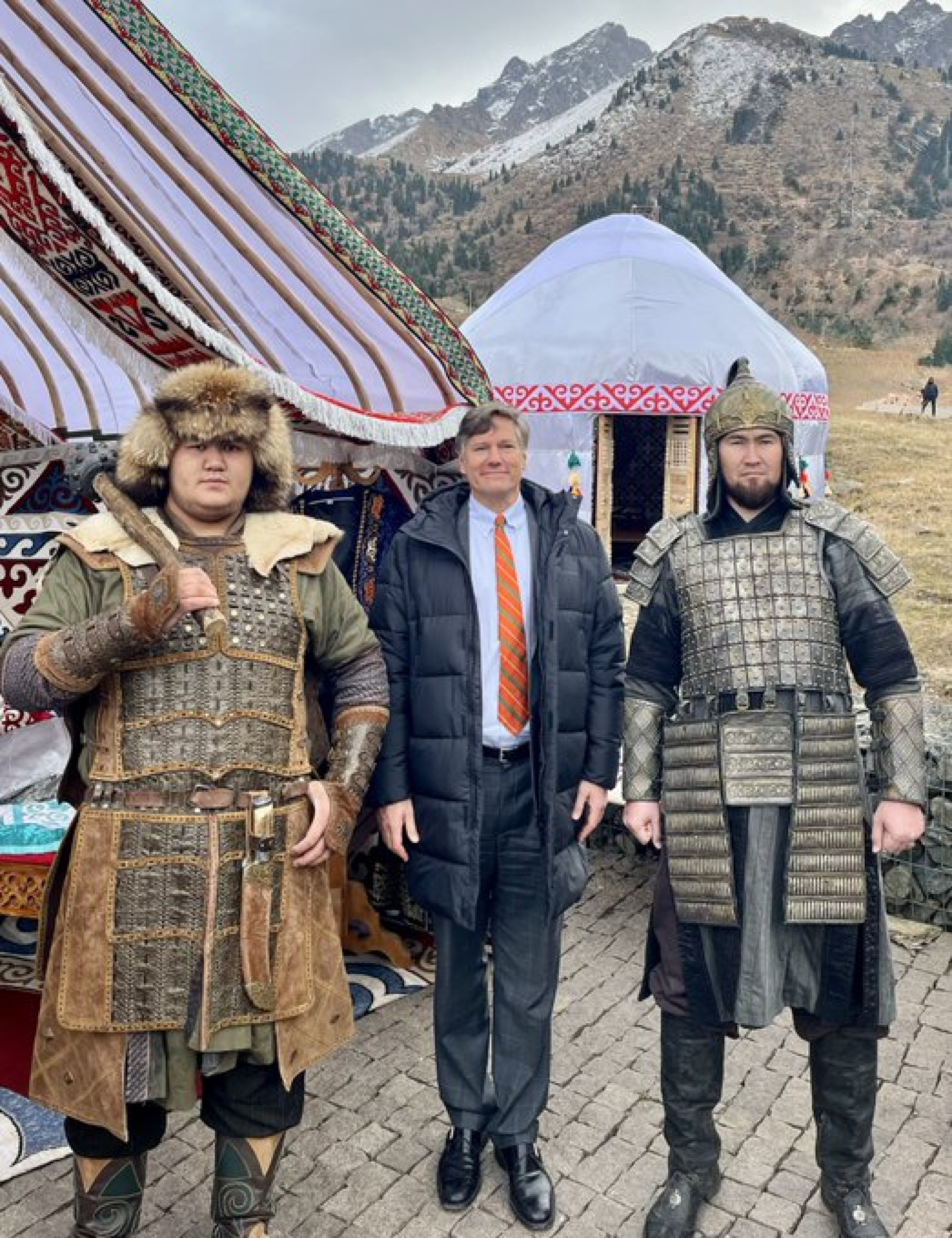 На фотографиях американский гость запечатлен в горах, с беркутом на руке и в компании казахских беркутчи в традиционных костюмах.