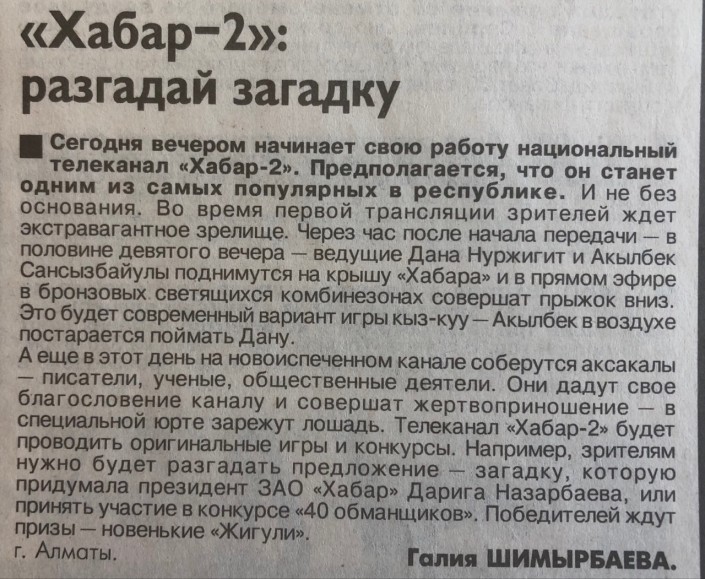 Особенно интересна заметка о современном варианте кыз-куу. Ведущие телеканала "Хабар-2" (который стал телеканалом "Ел Арна") Дана Нуржигит и Акылбек Сансызбайулы в "бронзовых светящихся комбинезонах" должны были подняться на крышу здания "Хабара" и в прямом эфире совершить прыжок вниз со специальной страховкой. Акылбек должен был в полете поймать Дану. Кроме того, было запланировано жертвоприношение.