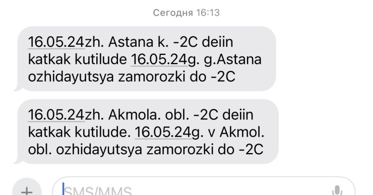 Ночью на севере Павлодарской, на севере, востоке Костанайской, Акмолинской, Северо-Казахстанской областей также ожидаются заморозки 2-3 градуса.