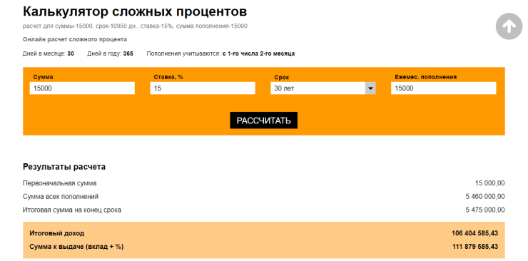 Если же ежемесячно откладывать по 15 тысяч тенге, то за 20 лет можно накопить 23 миллиона, а за 30 лет - 112 миллионов. Такие данные нам выдал калькулятор сложных процентов.