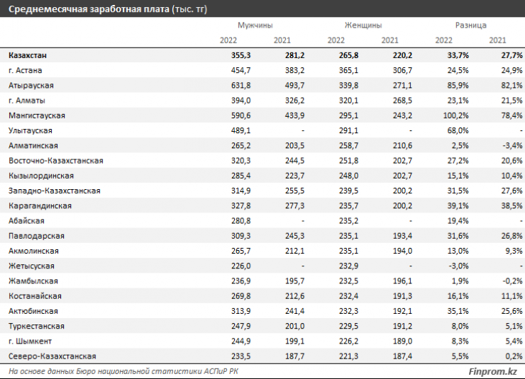В этих же регионах аналитики отметили самую значительную разницу в зарплатах мужчин и женщин. Например, в Мангистауской области зарплаты мужчин превышали зарплаты женщин в два раза, в Атырауской — на 85,9 процента, в Улытауской — на 68 процентов. В то же время в Жетысуской области женщины получали больше, чем мужчины, хоть и всего на 3,1 процента. При этом Жетысуская область — единственный регион, где отмечалась разница в пользу женщин.