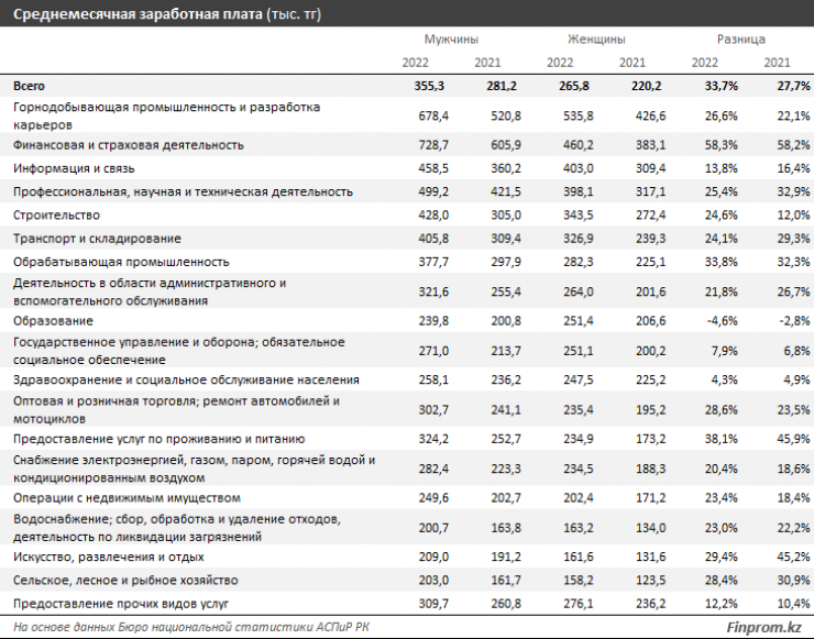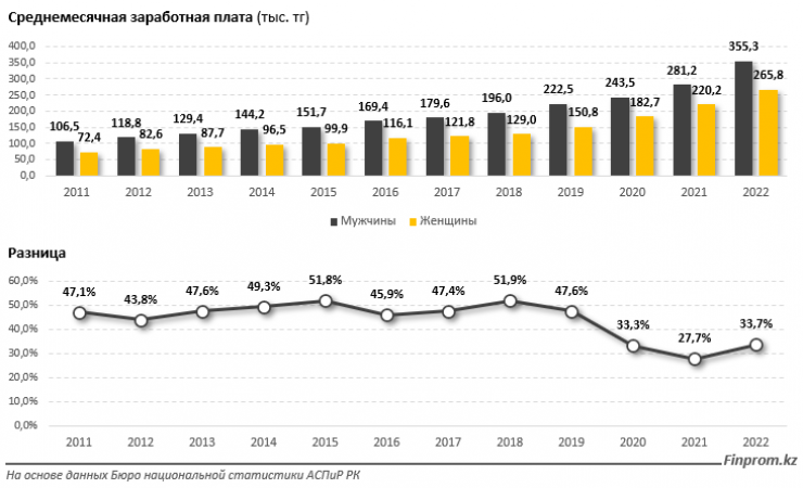 Согласно исследованию, в 2022 году мужчины в среднем зарабатывали на 34 процента больше женщин: 355,3 тысячи тенге против 265,8 тысячи тенге. Относительно среднемесячного показателя заработная плата мужчин была на 14,7 процента больше, женщин — на 14,2 процента меньше, чем в среднем по стране.
