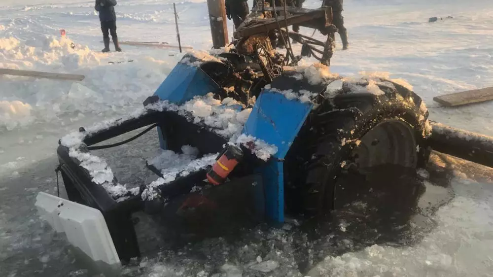 Трактор затонул еще 11 января на ледовой переправе Кызыл ту. Однако поднять технику на поверхность со дна удалось только 27 января, для чего пришлось соорудить специальную конструкцию.