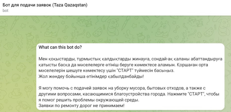 Минэкологии запустило Telegram-бот @TazaQazBot, куда казахстанцы могут направлять жалобы о проблемах города и экологии.