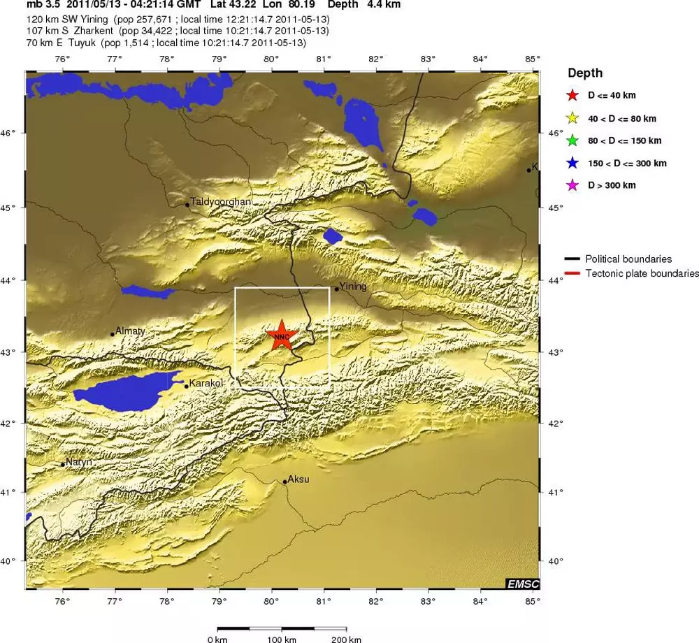 Очередное землетрясение произошло на границе Казахстана с Китаем, сообщается на сайте Европейского сейсмологического центра. Землетрясение магнитудой 3,5 произошло в 10.21 по времени Астаны. Эпицентр находился в 107 километрах к югу от Жаркента и в 120 километрах к юго-западу от китайского города Уйнинг. По данным сейсмологов, очаг подземных толчков находился на глубине четырех километров. Информации о жертвах и разрушениях не поступало. Напомним, серия землетрясений в на юге Казахстана произошла в начале мая. За сутки в Алматы было зафиксировано десять подземных толчков. По данным МЧС, в ближайшее время на территории республики разрушительных землетрясений не прогнозируется.
