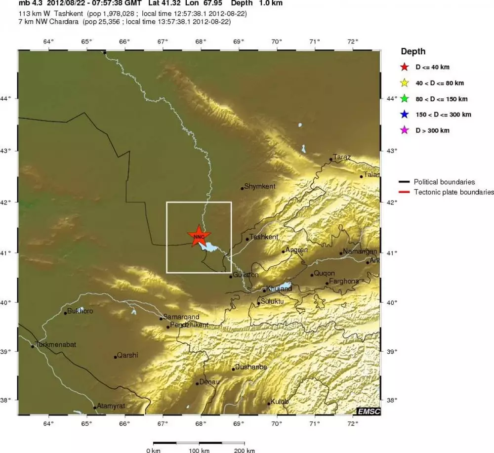 Подземные толчки глубиной один километр были зафиксированы в 13.57 по времени Астаны. Эпицентр землетрясение находился в семи километрах северо-западнее города Шардара Южно-Казахстанской области и в 113 километрах западнее Ташкента. Информации о жертвах и разрушениях нет.