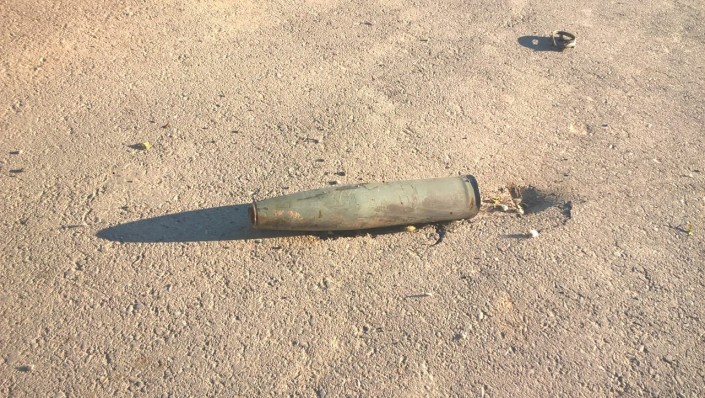 Басқа ракурстан түсірілген сол снаряд. Артқы жағында зымыранның реактив бөлігі жатыр. Егер қатты отыны жанып кетпесе қауіпті саналады.