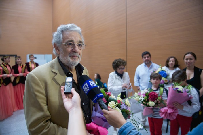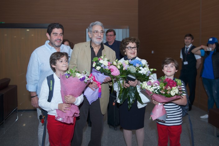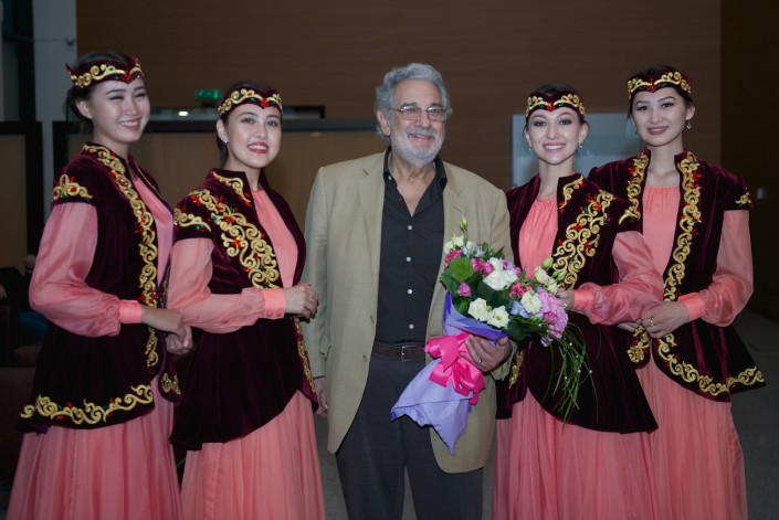 В "Международном аэропорту Нурсултана Назарбаева" маэстро встретила дирекция театра ГТОБ "Астана Опера". Заслуженный деятель Казахстана, директор театра Галым Ахмедьяров поприветствовал дорогого гостя, ну а девушки в национальных платьях подарили королю оперной сцены пышный букет цветов. К слову, маэстро прибыл не один, вместе с ним прилетела его супруга - Марта Доминго, являющаяся одним из членов жюри конкурса "Опералия", а также двое внуков.