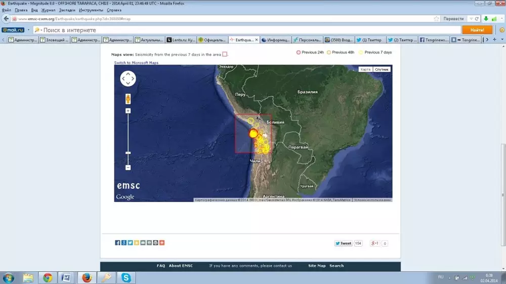 Подземный толчок был зафиксирован 1 апреля в 19.46 по местному времени (05.46 2 апреля по времени Астаны). Очаг подземных толчков зафиксирован на глубине 33 километров. Эпицентр землетрясения располагался в 93 километрах к северо-западу от города Икике, в котором проживает более 220 тысяч человек. Следом в этом же районе произошло еще несколько толчков магнитудой 5,0-5,5.