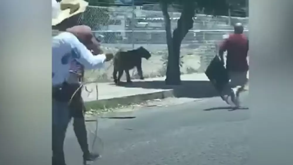Несколько человек преследовали животное, когда оно разгуливало по тротуару. Как видно на снятых кадрах, один мужчина блокировал тротуар, используя складной стул в качестве щита, а затем подбежал другой в ковбойской шляпе и удачно бросил лассо.