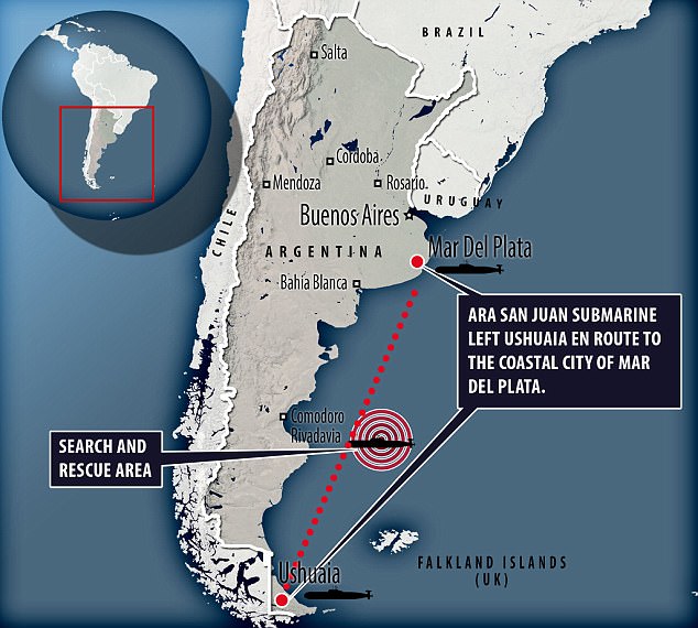 Субмарина совершала плановый маршрут из порта Ушуайя в город Мар-дель-Плата. В момент пропажи она находилась в 400 километрах от побережья Аргентины в Атлантическом океане. © dailymail