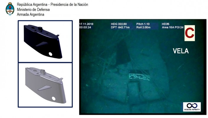 Между тем ВМС Аргентины опубликовали фото подводной лодки "Сан-Хуан". На кадрах показаны разрушенная часть корпуса и движущий винт. Также были идентифицированы другие части подводной лодки меньших размеров и форм, которые соответствуют носовой части и корме.