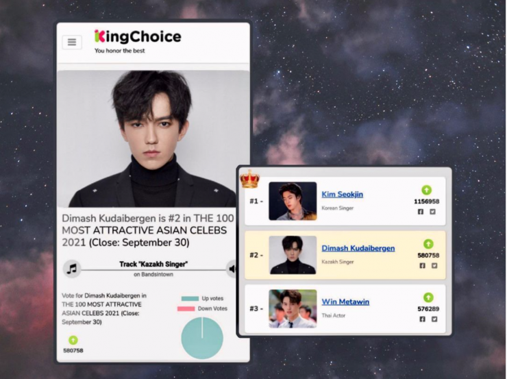Конкурс самых красивых азиатских людей продлится до 30 сентября. Димаш Кудайберген расположился на втором месте (1 290 408 голосов), уступая только солистку южно-корейской группы BTS Ким Сокджину с 1 973 428 голосами. На третьем месте пока находится тайский актер Уин Метавин с 967 161 голосом.