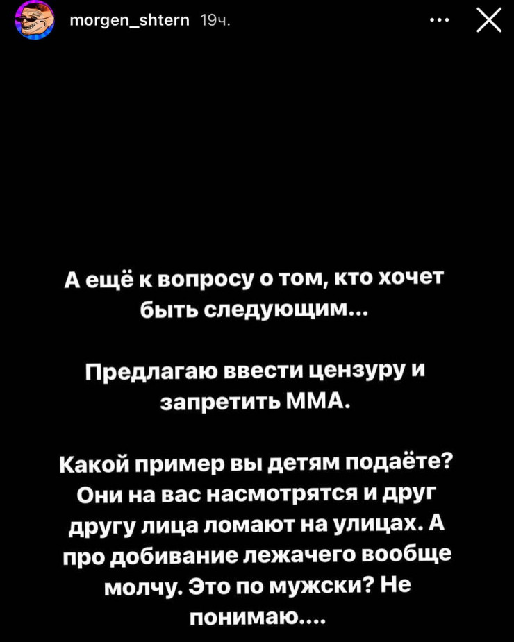 "Какой пример вы детям подаете? Они на вас насмотрятся и друг другу лица ломают на улицах. А про добивание лежачего вообще молчу. Это по-мужски? Не понимаю", - написал Моргенштерн в сторис своего Instagram.