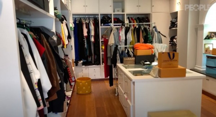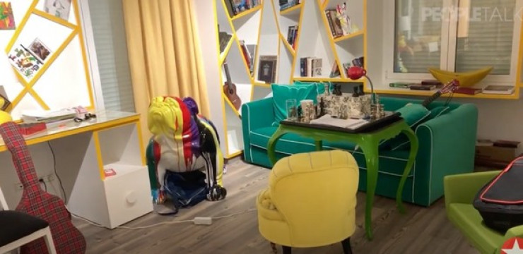 Пара показала несколько комнат в квартире - гардеробную, где на вешалках красуются дорогие наряды, кухню, а также кабинет, в котором юморист придумывает шутки.