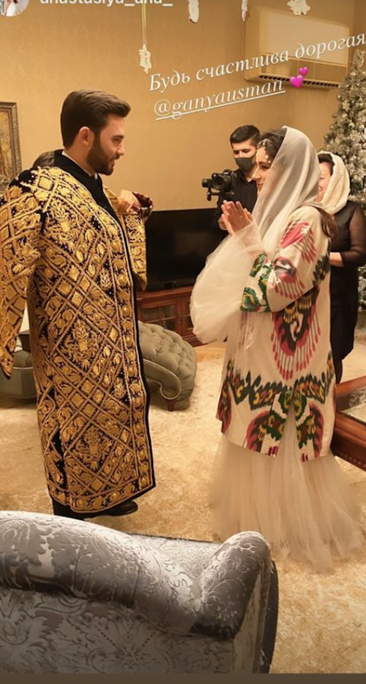 На одном из фото Усманова запечатлена в белом платье и национальной накидке, а ее будущий супруг - в чапане вышитом золотыми нитками. О личности жениха пока ничего не известно.