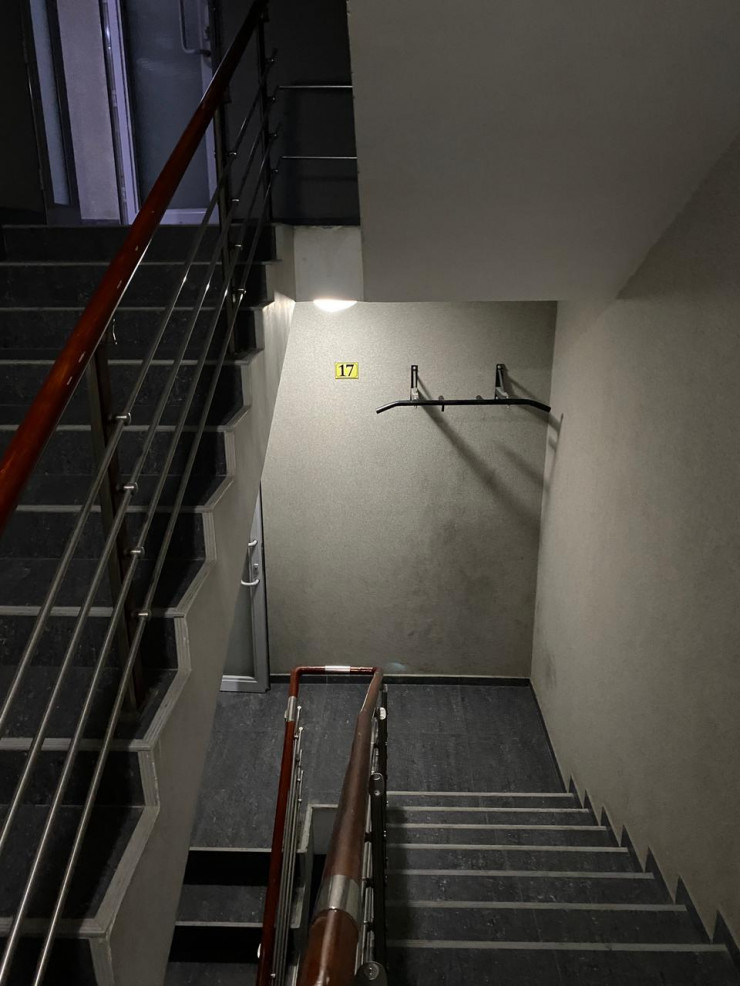 В подъезде сильно пахнет порохом. На 17-м этаже вынесена мебель, по всей видимости, из квартиры стрелка. Однако на его этаже тихо и спокойно, будто никто не живет.