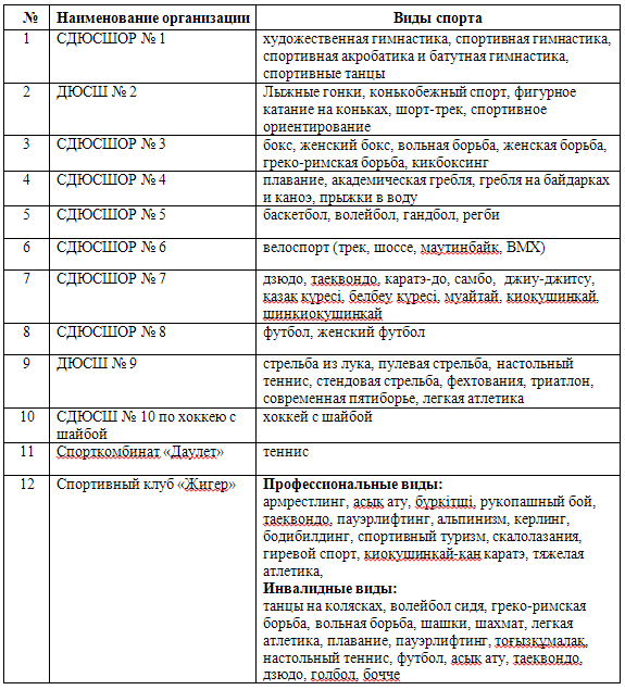 Подробный перечень с указанием детских спортивно-юношеских школ акимата Астаны и видов спорта прилагается.
