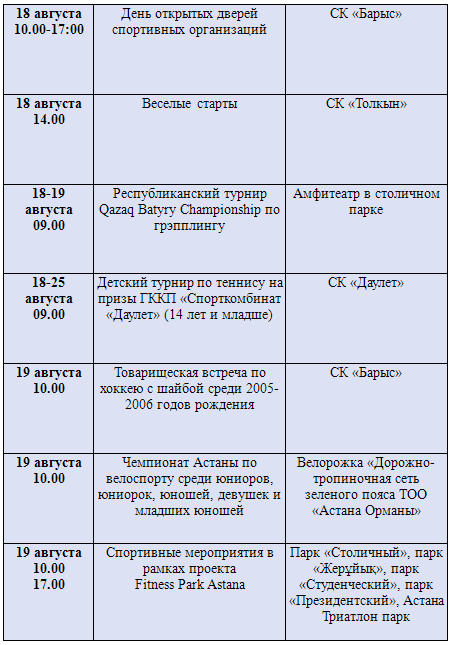 В эти дни все спортивные дворцы, комплексы и клубы города проведут соревнования и турниры, в которых примут участие около 3 000 спортсменов. Управление культуры и спорта Астаны приглашает не только профессионалов, но и всех любителей активного и здорового образа жизни, гостей и жителей столицы принять участие в запланированных мероприятиях.