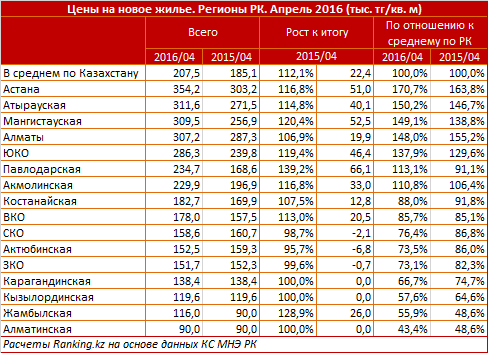 "Среди регионов самые дорогие новостройки в апреле зафиксированы в столице страны (354 тысячи тенге квадратный метр, что на 71 процентов выше среднего показателя по стране). На втором месте по дороговизне нового жилья расположился Атырауский регион, где стоимость составила 312 тысяч тенге (на 50 процентов выше аналога по стране). Замыкает тройку лидеров Мангыстау, где цены на первичном рынке недвижимости достигли отметки в 309,5 тысячи (на 49 процентов дороже стоимости на новое жилье по Казахстану)", - пояснили аналитики.