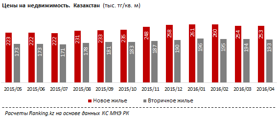 В апреле в Казахстане новое жилье подорожало на 12,5 процента, а вторичка на 11,5 процента. К такому выводу пришли специалисты аналитической службы Ranking.kz. По их информации, квадратный метр в апреле стоил 253,2 тысячи тенге в новостройках и 193,2 тысячи тенге на вторичном рынке.