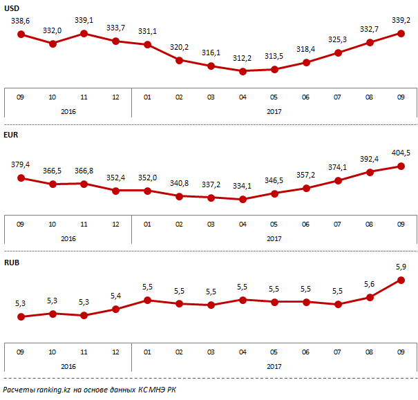 Около половины всех продаж евро за январь-август 2017 года были произведены обменными пунктами Алматы - 352,3 миллиона евро, доля от РК - 48,4 процента. На втором месте Астана - обменными пунктами столицы было продано 129,3 миллиона евро, доля от РК - 17,7 процента. Замыкает топ-3 Карагандинская область - 40,4 миллиона евро, доля от РК - 5,5 процента.
