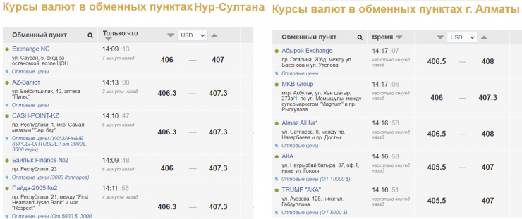 Между тем в обменниках Нур-Султана, по данным kurs.kz, доллар продают за 407-407,3 тенге, покупают - по 406-406,3 тенге. Обменные пункты Алматы сообщают о продаже доллара за 407-408 тенге и о покупке валюты за 405,5-406,5 тенге.
