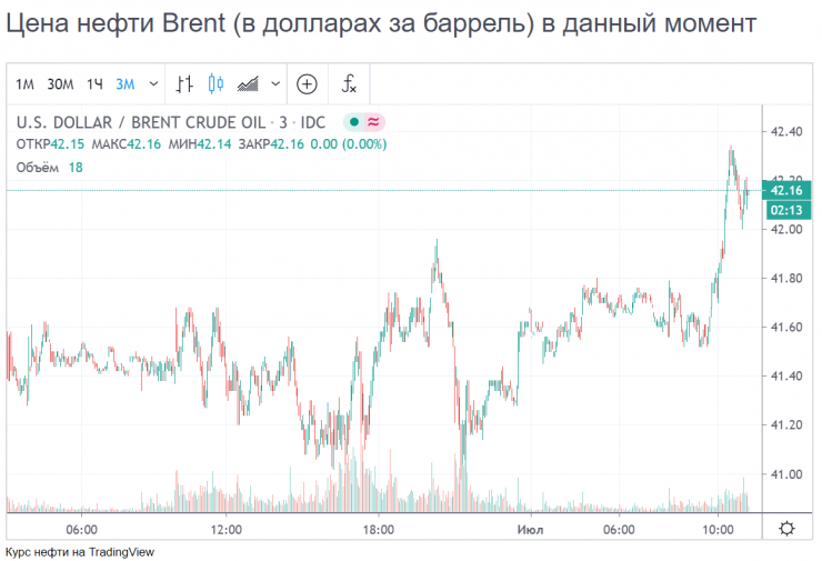 Сейчас цена нефти марки Brent находится на уровне 42,1 доллара за баррель.