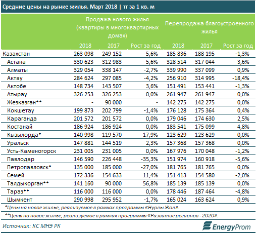 На вторичном рынке самые высокие цены - в южной столице (340 тысяч тенге за квадратный метр, на 0,9 процента больше, чем год назад).