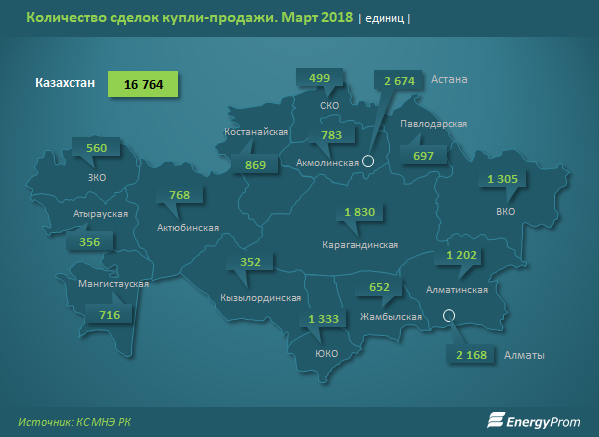 Еще 12,9 процента пришлось на Алматы (2,2 тысячи сделок, сразу на 16 процента меньше, чем год назад) и 10,9 процента - на Карагандинскую область (1,8 тысячи сделок, на 4,8 процента меньше, чем в марте 2017).