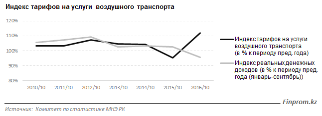 "За год тарифы на авиаперевозки выросли на 12 процентов, при этом реальные доходы населения РК сократились на 4 процента", - поделились эксперты finprom.kz.