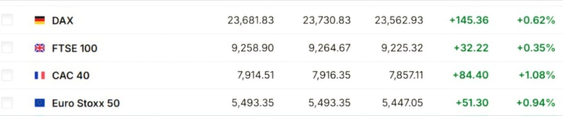 Из основных индексов DAX (+0,62 процента, Германия), CAC 40 (+1,08 процента, Франция) и Euro Stoxx 50 (+0,94 процента, включает 50 крупнейших и наиболее ликвидных компаний стран еврозоны), FTSE 100 (+0,35 процента, Великобритания) перешли в рост.