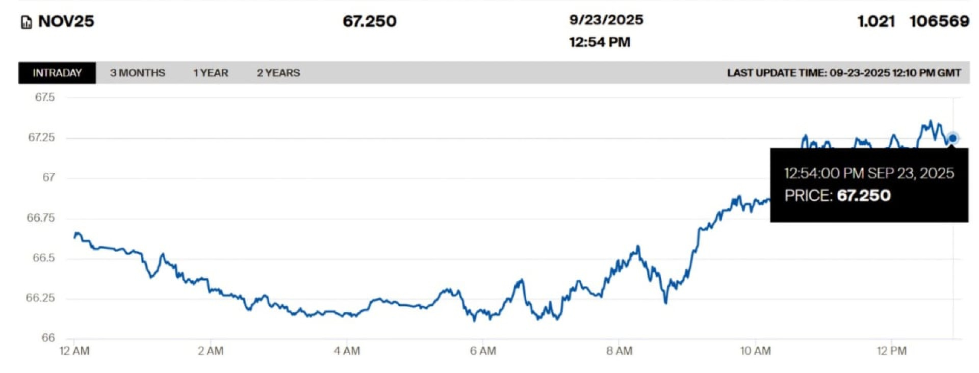 Цена ноябрьских фьючерсов на нефть марки Brent на лондонской бирже ICE повысилась на 1,02 процента - до 67,25 доллара за баррель.