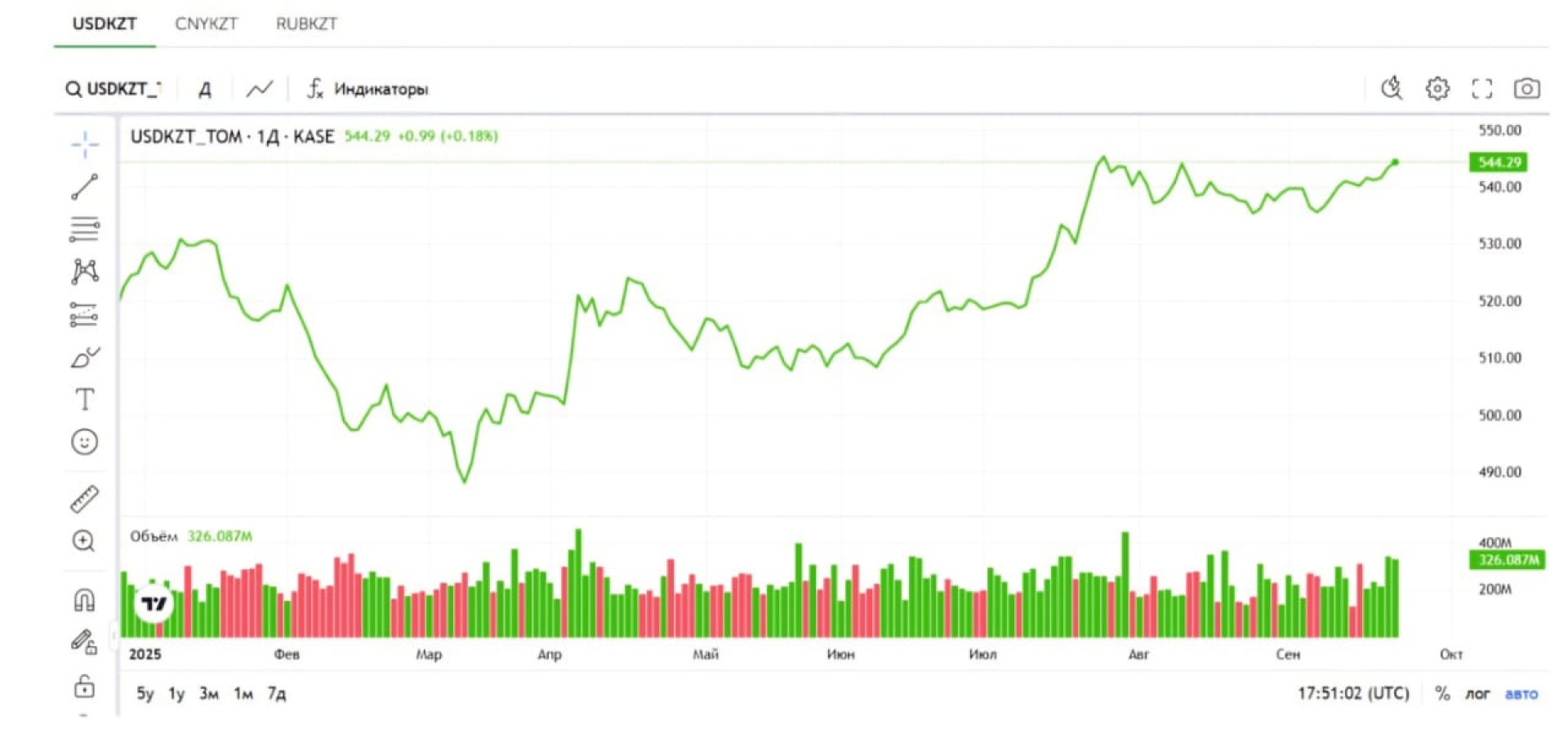 При этом по итогам торгов на Казахстанской фондовой бирже (KASE, на 17:00 по времени Астаны) средневзвешенный курс доллара составил 544,91 тенге, повысившись на 1,98 тенге.