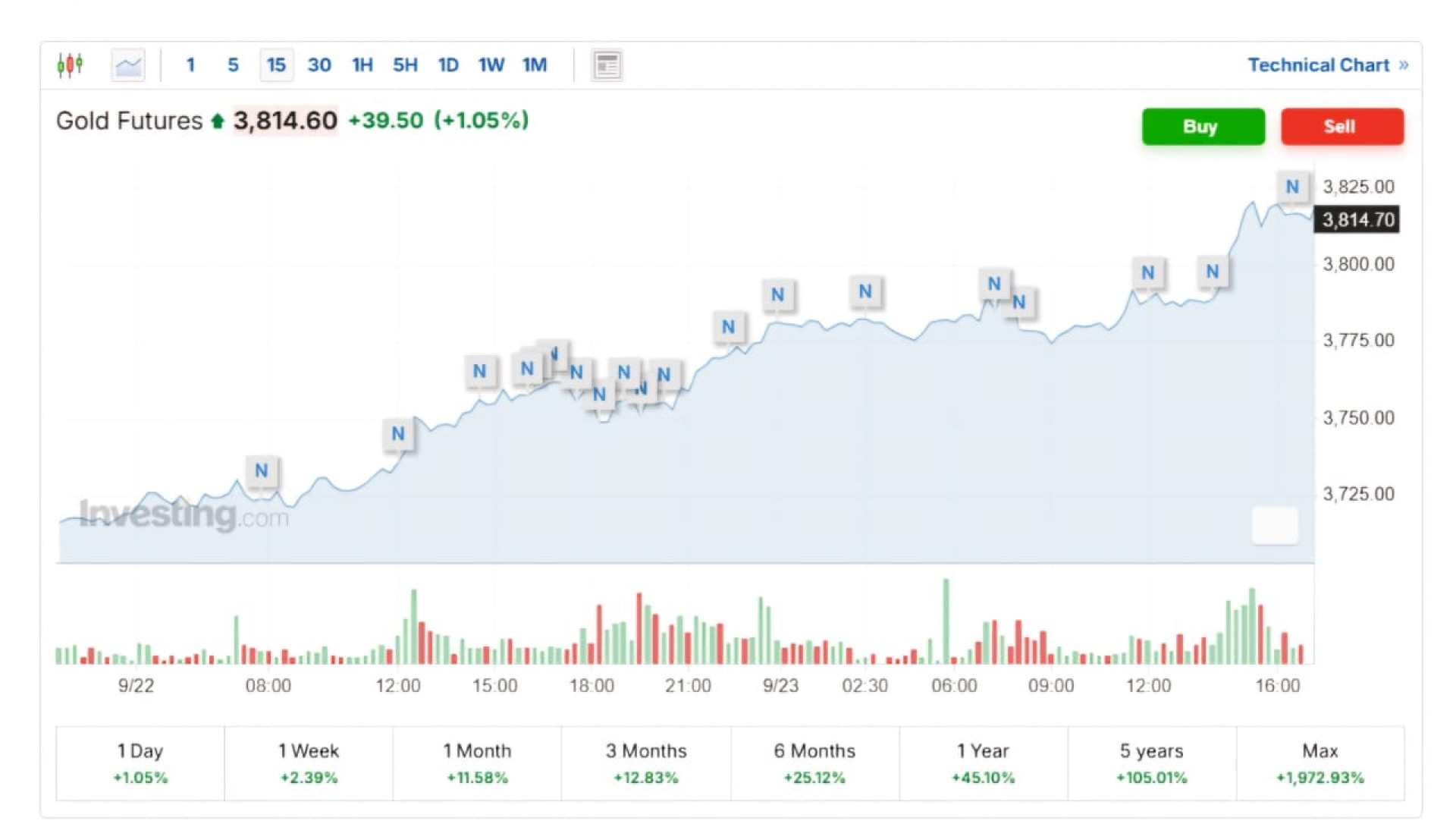 Золото снова обновило предельные максимумы, потому что инвесторы ищут безопасные активы из‑за неопределённости в экономике и осторожных сигналов ФРС о будущих ставках.