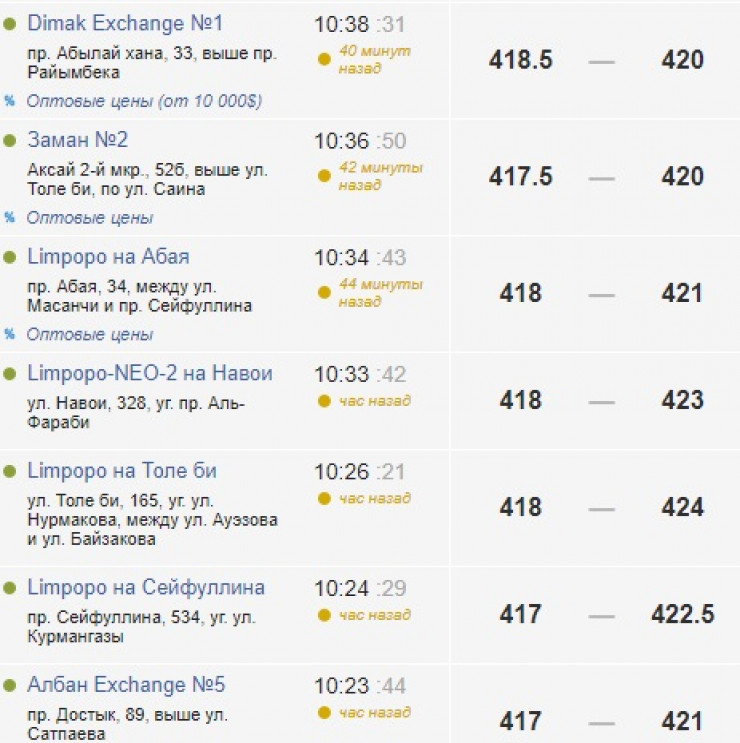 Курс доллара в обменниках Алматы. Скриншот Kurs.kz